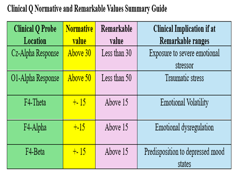 (Q- EEG) biomarkers provide a precise method for better diagnosis, treatment, and monitoring of treatment responses [18]. Table 1. presents the clinical normative and remarkable values for Clinical Q-EEG used to evaluate the results of our participants.